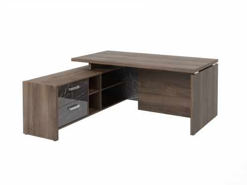 Столешница, бок стола и бок тумбы выполнены из ЛДСП толщиной 38 мм. Цвет - "Орех Пацифик Табак". Кромка 2 мм.