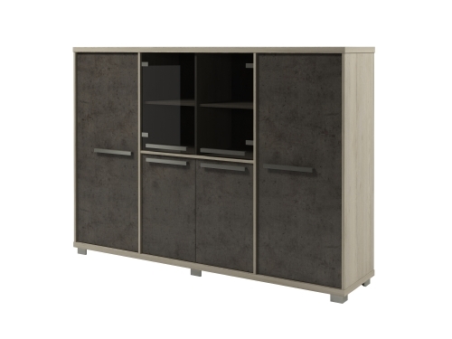 Секции 2, 3, 4 - стеллаж с 4 полками. Две полки с возможностью установки на разную высоту. Две двери глухие. В двух секциях в нижней части двери ЛДСП, сверху стеклянные двери.